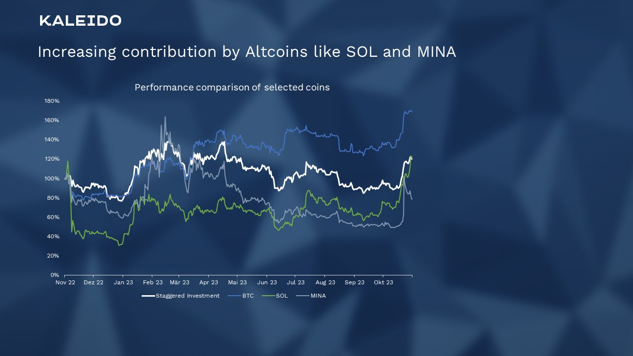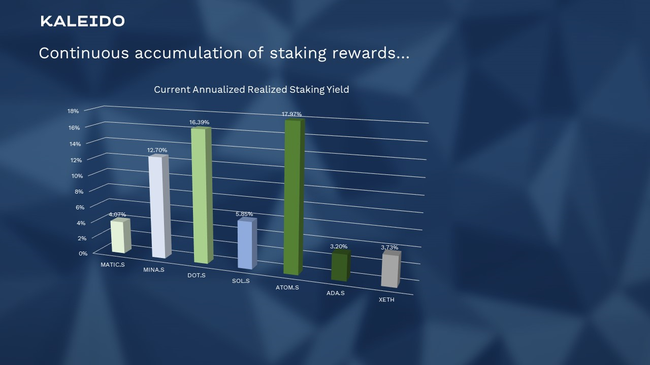 Staking rewards continue to contribute significantly to the overall performance of the portfolio, with staking yields between 3.2% (ADA, Cardano) and 18% (ATOM, Cosmos).
